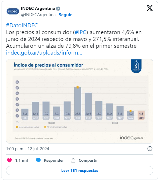 El índice de inflación en Argentina fue de 4,6 % en junio y acumuló un 271,5 % interanual, informó el Instituto Nacional de Estadística y Censos (Indec).