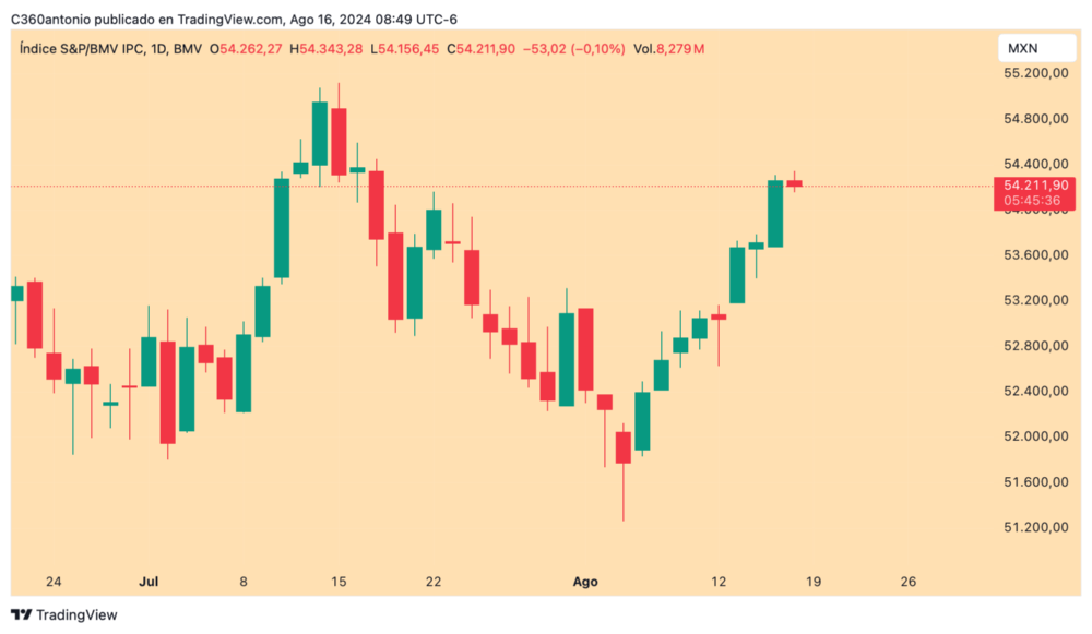 Luego de una semana de datos positivos de inflación, ventas minoristas y laborales en Estados Unidos, los inversionistas reducen sus temores de recesión. El S&P/BMV IPC perfila una segunda semana de ganancias acumuladas, recuperando 2.18 por ciento.