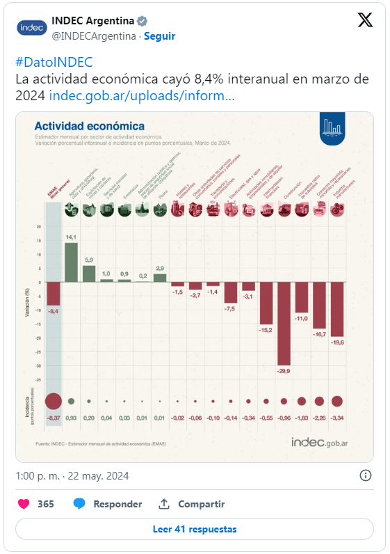 El Instituto Nacional de Estadística y Censos (Indec) informó que en marzo el Estimador Mensual de Actividad Económica (EMAE) registró una caída de 8,4 % en la comparación interanual.