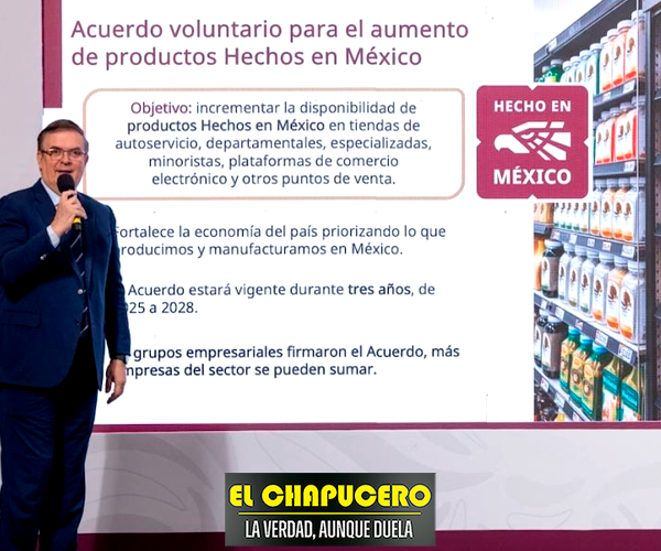 Ebrard agregó: “Van a tener una estrategia especial de promoción y comercialización de productos, que va a decir, de Hecho en México, ustedes lo van a ver pronto, ya lo vamos a anunciar. Y vamos a aumentar, la meta es aumentar también la disponibilidad y ubicación, visibilidad de los productos hechos en México. Porque hoy no es fácil en esas plataformas que sepas quién hace qué”.