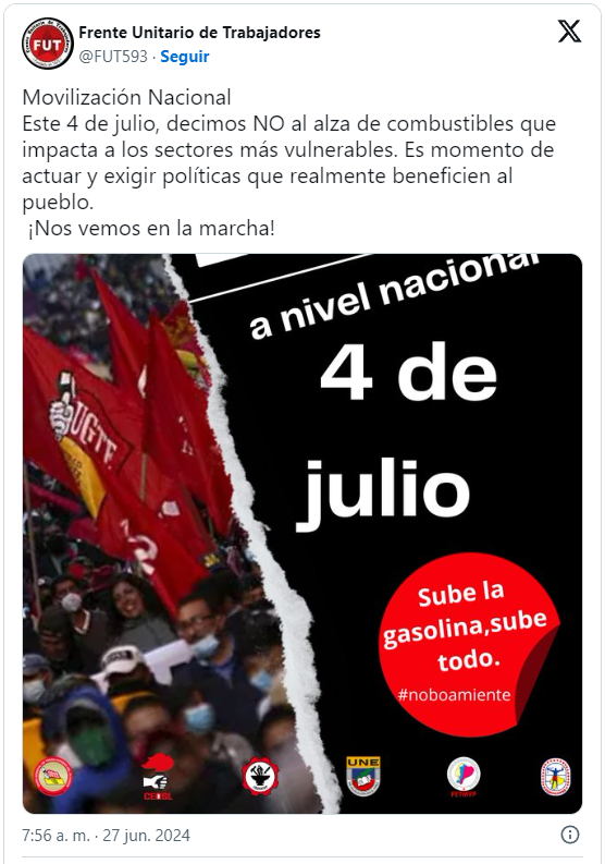 Por su parte, el Frente Unitario de Trabajadores (FUT), que aglutina a otras organizaciones, convocó a una movilización a nivel nacional para el próximo 4 de julio.