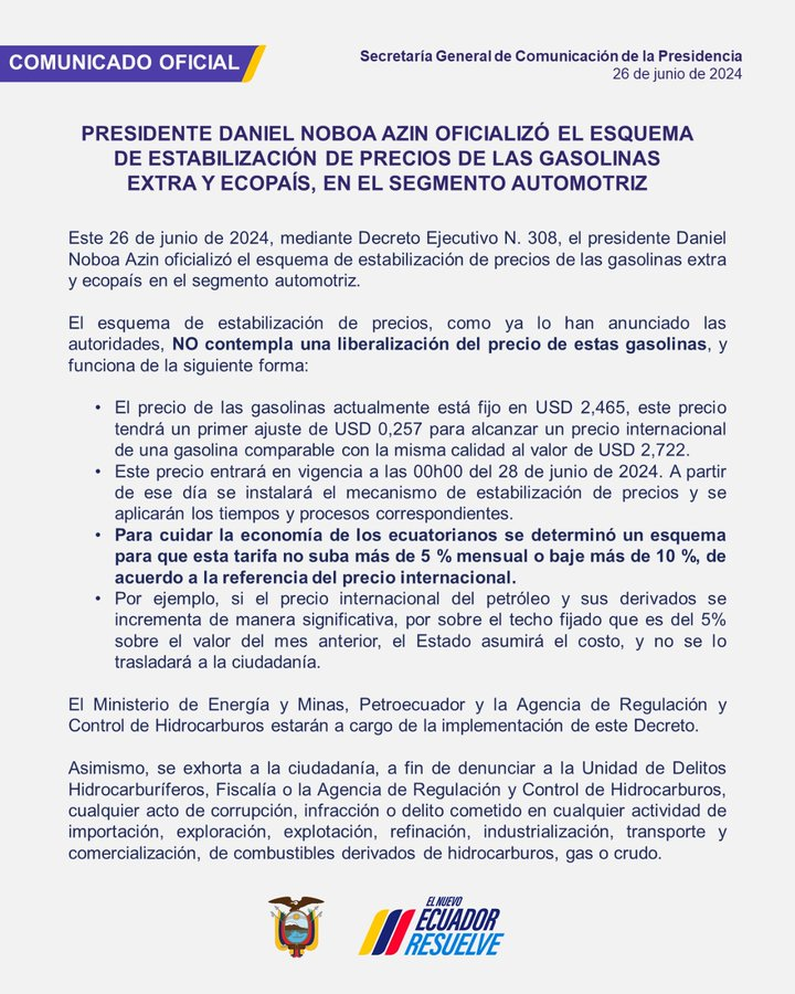 El miércoles, como ya se había anunciado previamente, Noboa emitió el Decreto Ejecutivo 308, mediante el cual establece la «regulación» de precios y, con ello, formaliza la eliminación gradual del subsidio estatal a estas gasolinas.