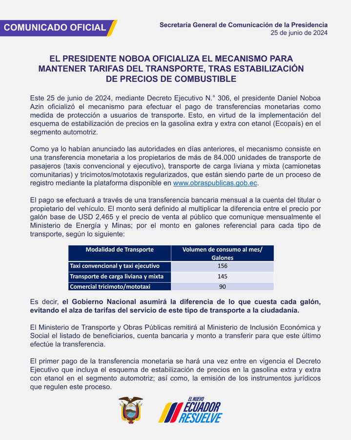 Un día antes, Noboa emitió el Decreto Ejecutivo 306, que comienza a regir con el alza del aumento de los precios de las gasolinas, en el cual se establece un mecanismo de compensación a los transportistas.