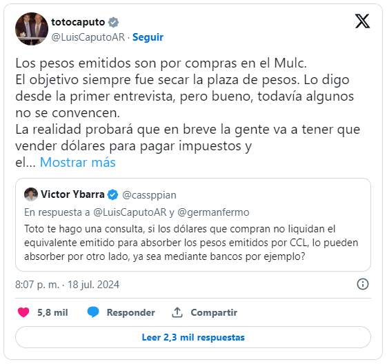 «El objetivo siempre fue secar la plaza de pesos. Lo digo desde la primer (a) entrevista, pero bueno, todavía algunos no se convencen. La realidad probará que en breve la gente va a tener que vender dólares para pagar impuestos y el peso va a ser la moneda fuerte», escribió el funcionario el jueves por la noche en un post de la red social X.