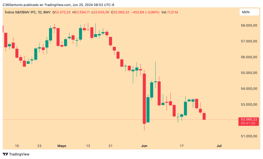 El índice líder de la Bolsa Mexicana de Valores (BMV), el S&P/BMV IPC, que mide a las acciones locales más negociadas, cede 0.87% a un nivel de 52,055.19 puntos. El FTSE BIVA, de la Bolsa Institucional de Valores (Biva), cae 0.86% hasta 1,065.19 puntos.