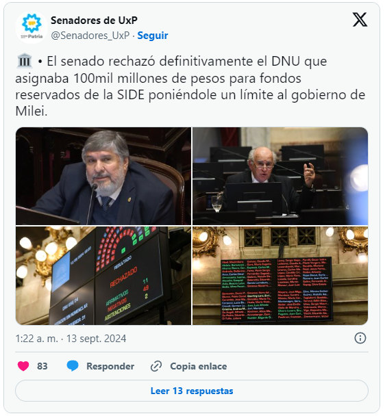 El Senado de Argentina derogó el jueves, con 49 votos en rechazo y 11 para que siga en vigencia, el Decreto de Necesidad y Urgencia (DNU) del presidente Javier Milei, que destinó a la Secretaría de Inteligencia del Estado (SIDE) «fondos reservados» por un total de 100.000 millones de pesos (alrededor de 107,9 millones de dólares).
