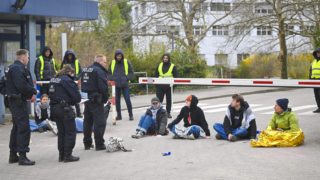 Al menos siete manifestantes del grupo “Pacíficamente contra el Genocidio” se pegaron al suelo y a una valla, impidiendo el acceso al recinto. Corearon consignas contra la empresa y acusaron al Gobierno alemán de complicidad en el conflicto de Oriente Medio.