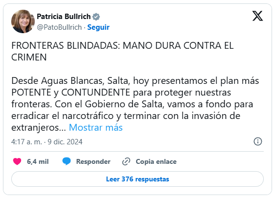 Previo al acto, la titular de Seguridad afirmó desde su cuenta de X que el paquete de medidas que se aplicará junto al Gobierno de Salta irá «a fondo para erradicar el narcotráfico» y terminar con la supuesta «invasión de extranjeros ilegales», que, según su criterio, se «roban el futuro y la libertad».