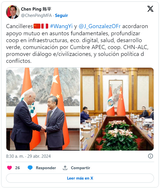 Por su parte, el ministro de Economía y Finanzas, José Arista, indicó a la emisora local RPP que González-Olaechea viajó con el objetivo, entre otras cosas, de tener las «primeras conversaciones para un futuro viaje de la presidente a fin de promover inversión china en el Perú».