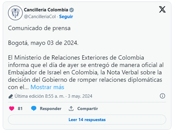La víspera, el canciller colombiano, Luis Gilberto Murillo, informó sobre la determinación anunciada por el presidente colombiano, Gustavo Petro, el pasado miércoles, en rechazo a las agresiones del Gobierno de Israel contra la población palestina que se encuentra en la Franja de Gaza, lo que ha causado la muerte de más de 34.000 personas, desplazamiento y hambruna.