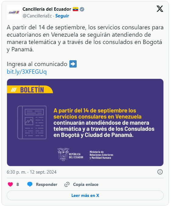 Ante el cierre, los servicios consulares para los ecuatorianos, como pasaportes de emergencia, apostillas y legalizaciones, serán atendidos a través de los consulados de Ecuador en Bogotá y Panamá, vía telemática.
