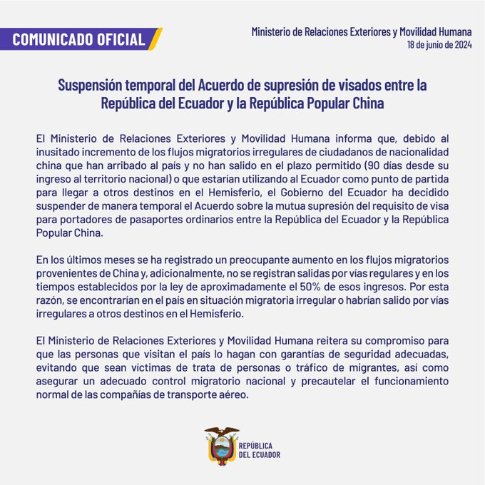En un comunicado, el Ministerio de Relaciones Exteriores y Movilidad Humana manifestó que tomó la medida ante el «incremento de los flujos migratorios irregulares de ciudadanos de nacionalidad china que han arribado al país«. Según se explica en el escrito, estos ciudadanos «no han salido en el plazo permitido de 90 días» desde que ingresaron a territorio ecuatoriano.
