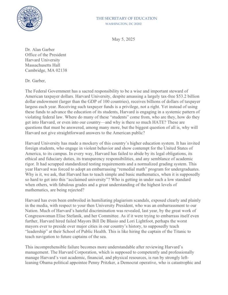 En una carta publicada el martes en X, la secretaria del Departamento de Educación, Linda McMahon, acusó a Harvard de “graves fallas” en antisemitismo, discriminación racial, rigor académico y diversidad de puntos de vista.