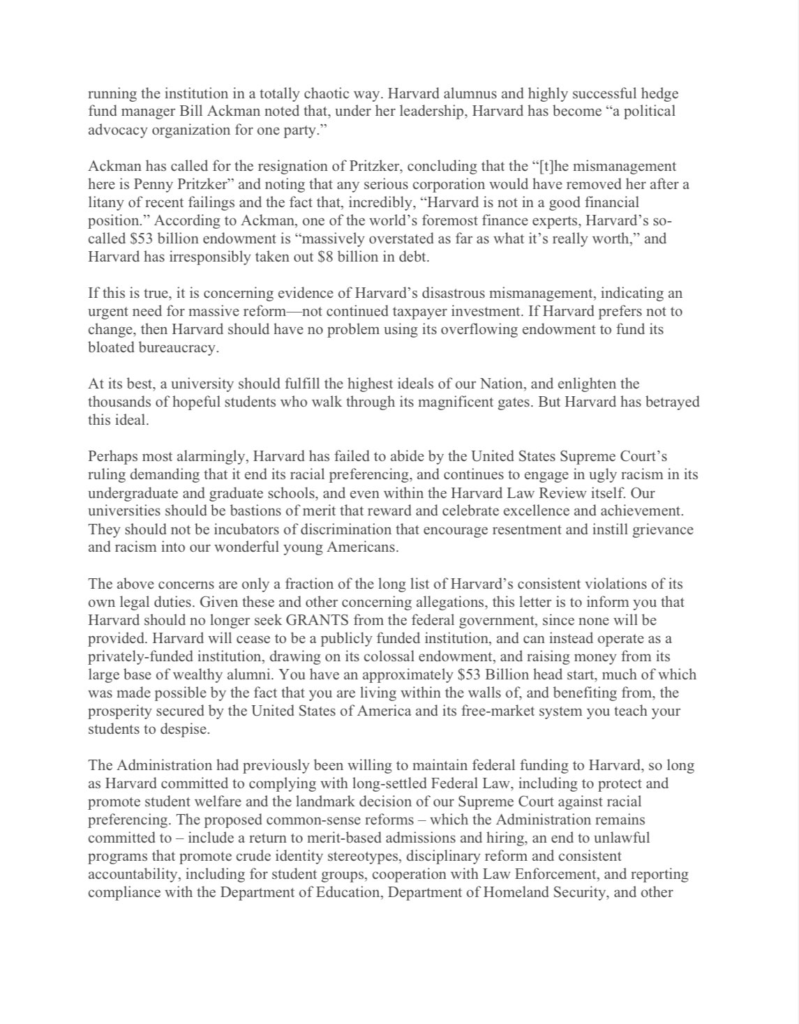 La carta decía que Harvard tendría que entablar conversaciones con el gobierno y demostrar que había cumplido con las demandas de la administración para recuperar la elegibilidad para nuevas subvenciones.