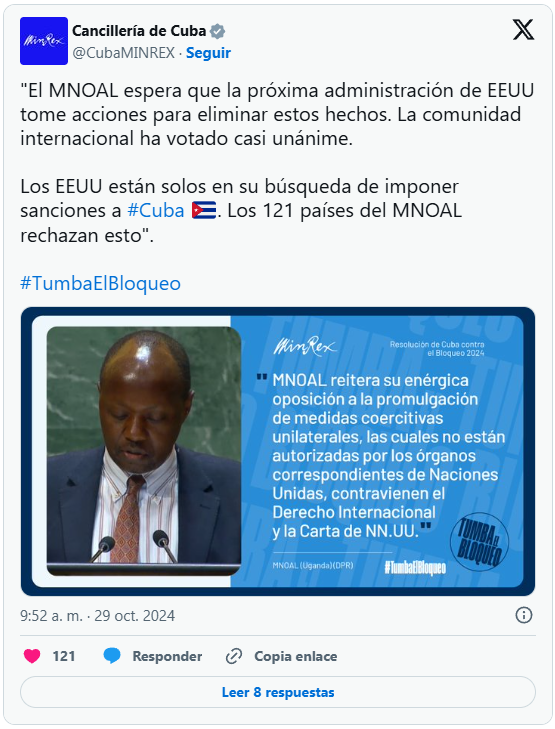 A esos bloques se suma el Movimiento de países no Alineados (MNOAL), cuyo pronunciamiento estuvo a cargo del representante de Uganda. Señaló que el embargo es una «medida ilícita» que quebranta «los principios» y vulnera el derecho internacional.