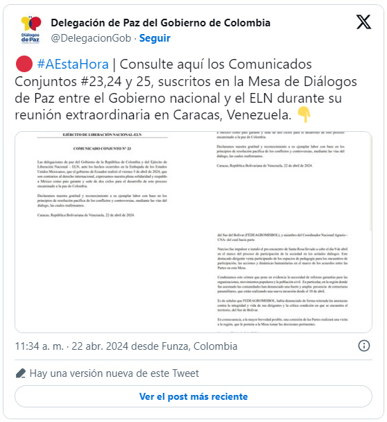 Las delegaciones de paz también condenaron los hechos ocurridos en la embajada mexicana en Quito, Ecuador, el pasado 5 de abril, y consideraron que estas acciones del Gobierno de Ecuador, son contrarias al derecho internacional. Por ello, expresaron su gratitud, reconocimiento, respaldo y solidaridad con México, como país garante del proceso de paz de Colombia.