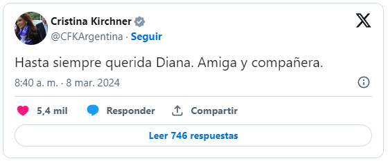 La noticia también fue confirmada por la expresidenta Cristina Fernández de Kirchner, quien publicó un mensaje en su cuenta en X: «Hasta siempre querida Diana. Amiga y compañera«.