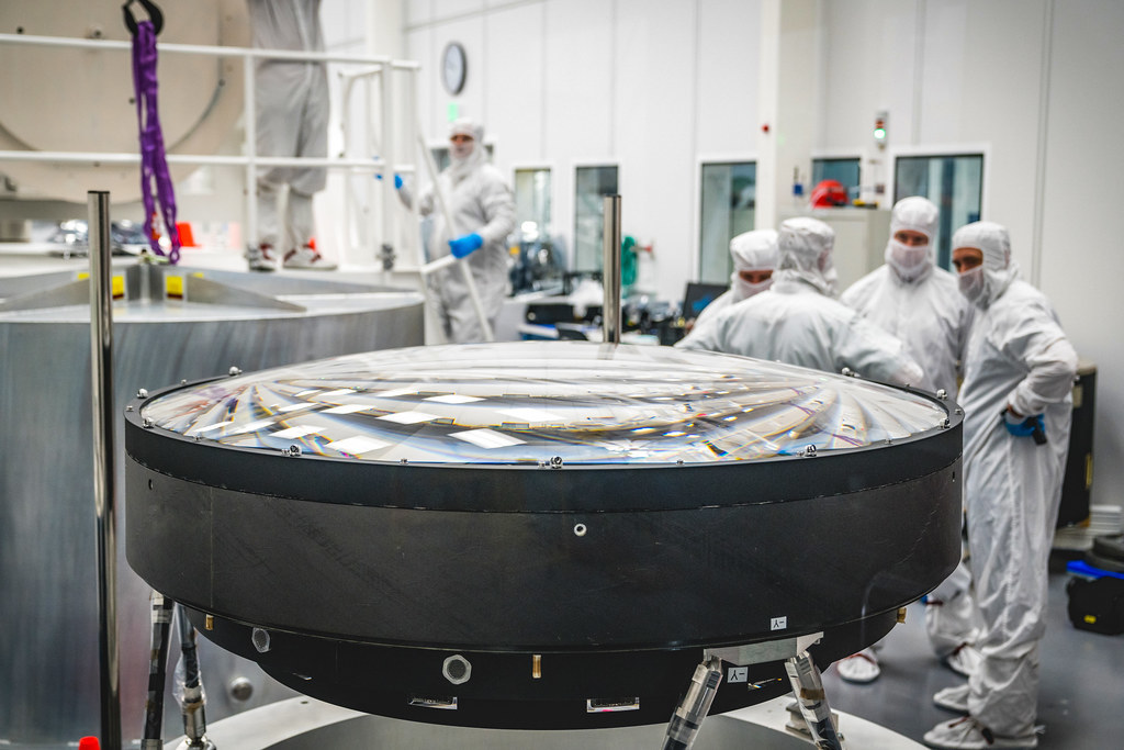Otra lente de un metro de ancho tuvo que diseñarse especialmente para mantener la forma y la claridad óptica, mientras que sella la bomba de vacío que alberga el enorme plano focal de la cámara. Este último se compone de 201 sensores individuales diseñados a medida y es tan plano que no varía más de una décima parte del ancho de un cabello humano. Los píxeles en sí tienen únicamente 10 micrones de ancho.