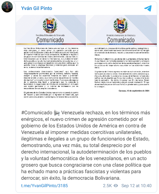 Según una publicación en Telegram del viceministro de Políticas Antibloqueo, William Castillo, «tras el fracaso del golpe electoral y ciber terrorista del 28 de julio», Washington ya suma 947 medidas coercitivas unilaterales contra el país suramericano.
