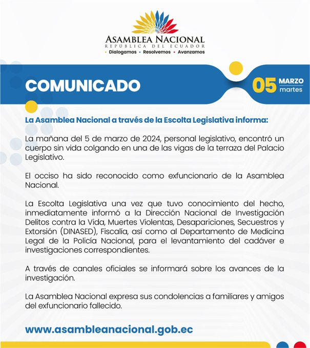 «El occiso ha sido reconocido como exfuncionario» de la Asamblea Nacional, detalló la institución.