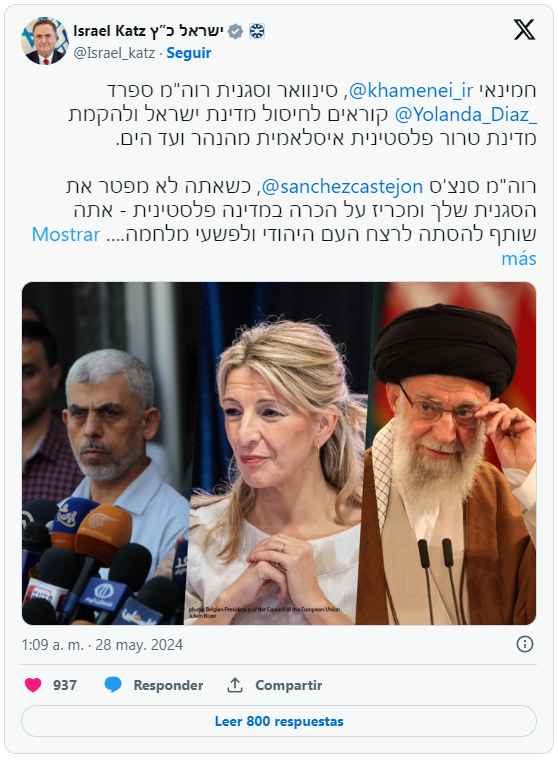 El canciller israelí equipara al líder supremo de Irán, Alí Jamenei, y al actual líder de la organización Hamás, Yahya Sinwar, con la vicepresidenta segunda de España y ministra de Trabajo, Yolanda Díaz, al afirmar que los tres «piden la eliminación del Estado de Israel y el establecimiento de un Estado terrorista islámico palestino desde el río hasta el mar».