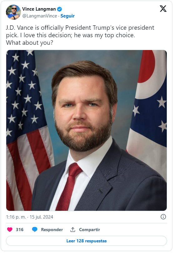 El exmandatario escribió en su red social Truth Social: «Tras largas deliberaciones y reflexiones, y teniendo en cuenta el enorme talento de muchos otros, he decidido que la persona más adecuada para asumir el cargo de vicepresidente de los Estados Unidos es el senador James David Vance, del gran estado de Ohio».