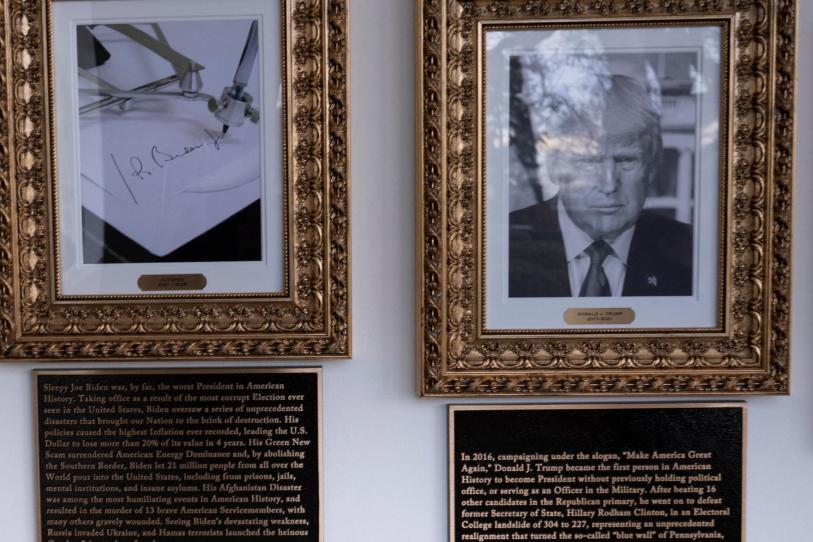 En el caso de Joe Biden, se le describe como «el dormilón Joe Biden», «de lejos el peor presidente» de EE.UU., reiterando la falsa afirmación de fraude en las elecciones de 2020. En lugar de su retrato, se exhibe una máquina de firma automática (autopen).