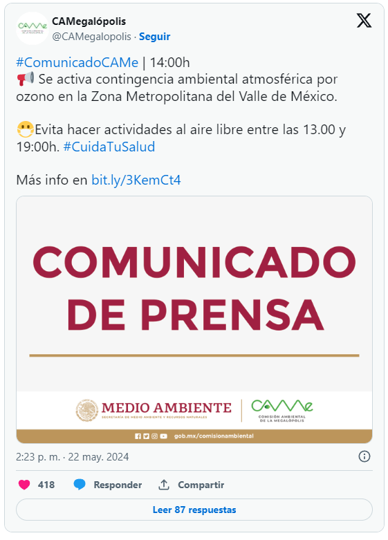 La Comisión Ambiental de la Megalópolis (CAMe) activó la Fase 1 de la Contingencia Ambiental por ozono en el Valle de México.