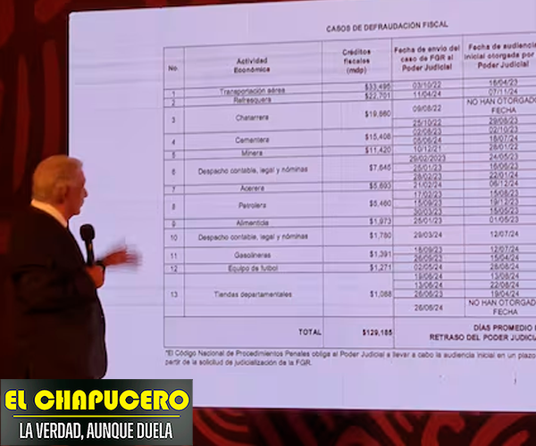 Para seguir con el tema de por qué es necesaria la reforma al Poder Judicial, AMLO mostró una tabla de las empresas que deben impuestos, pero sus casos están detenidos porque no les han dado fechas de audiencia o algunas otras situaciones.
