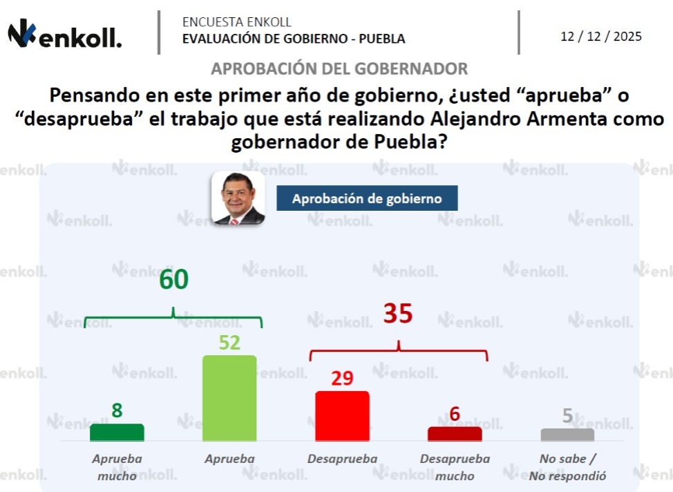 Al cumplir su primer año de gobierno, el gobernador Alejandro Armenta obtiene una aprobación del 60 % entre los poblanos, según encuesta de Enkoll levantada en diciembre