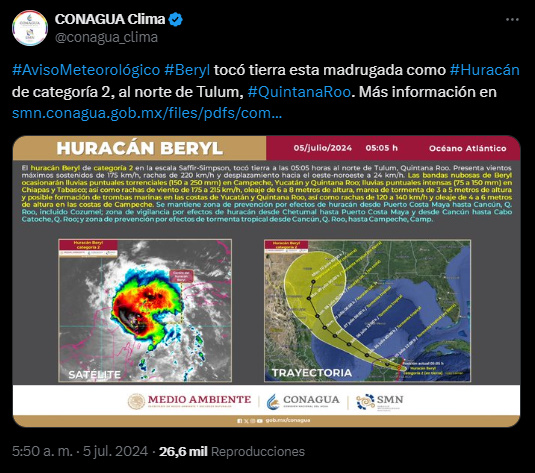 Las autoridades mexicanas reportaron que el Huracán Beryl llegó esta madrugada a las costas de Quintana Roo, un estado ubicado en el sureste del país.