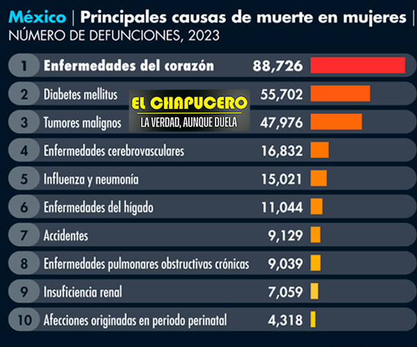 El ranking de las 10 principales causas de muerte en mujeres fueron enfermedades cerebrovasculares, influenza y neumonía, enfermedades del hígado, accidentes, enfermedades pulmonares obstructivas crónicas e insuficiencia renal.