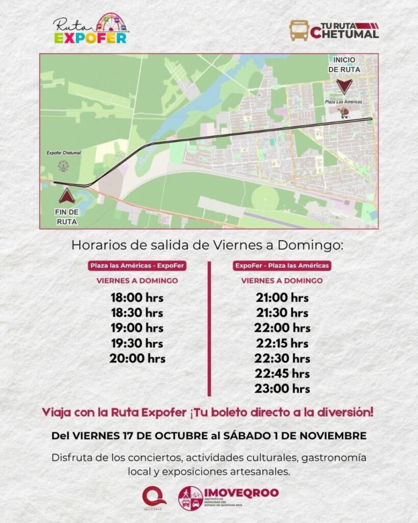 Los horarios de la Ruta Expofer estarán vigentes de viernes a domingo, salidas desde Plaza Las Américas hacia Expofer a las 18:00, 18:30, 19:00, 19:30 y 20:00 horas, para que llegues a tiempo a los conciertos estelares y la edición 50 de esta feria legendaria. Y el regreso seguro, desde Expofer a las 21:00, 21:30, 22:00, 22:15, 22:30, 22:45 y 23:00 horas, hasta las 23:00.