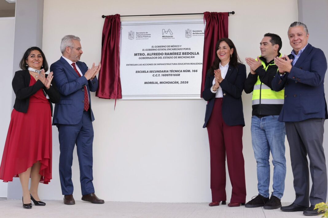 El gobernador de Michoacán Alfredo Ramírez Bedolla inauguró las nuevas instalaciones de la Escuela Secundaria Técnica 166, obra en la que se invirtieron 12 millones de pesos para la construcción de un edificio con seis aulas, laboratorio, patio cívico, cancha de usos múltiples, entre otras amenidades.
