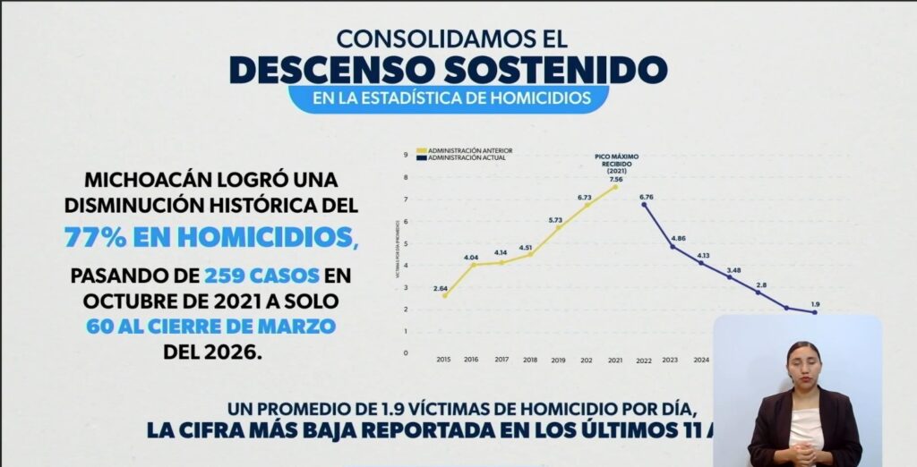 En términos diarios, explicó Ramírez Bedolla, el promedio cayó de 7.56 a 1.9 homicidios, tendencia que atribuyó a la coordinación que impulsó entre la Guardia Nacional, la Marina y las fuerzas estatales. «Son cifras históricas», afirmó el gobernador, quien sostuvo haber convertido la seguridad en el eje central de su administración.