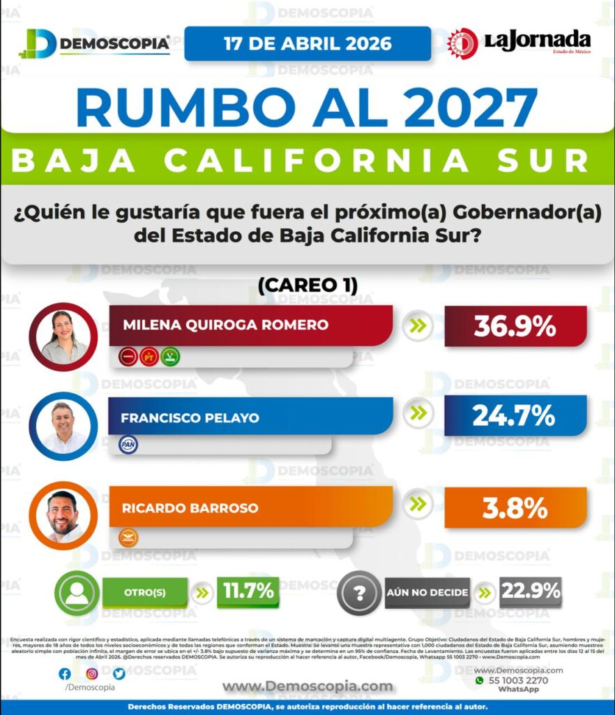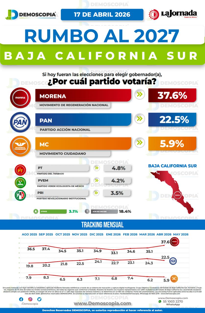 El estudio también ubica a Morena al frente de la intención de voto partidista en BCS con 37.6%, contra 22.5% del PAN. El levantamiento se realizó entre el 12 y el 15 de abril de 2026 con mil entrevistas telefónicas, un margen de error de ±3.8% y un nivel de confianza de 95%.