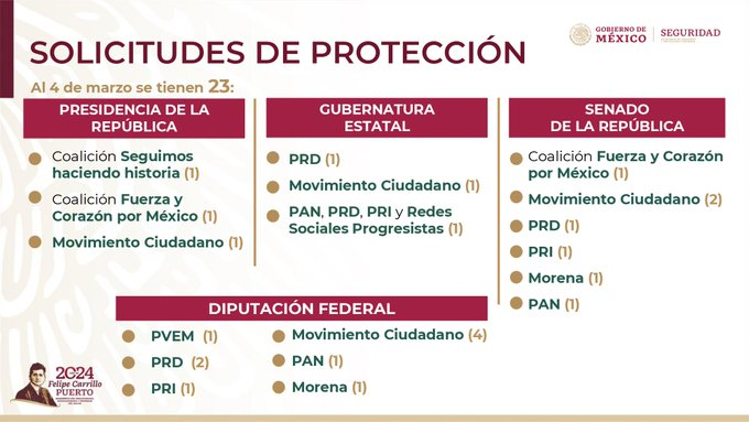 Hasta este martes, el Gobierno de López Obrador ha recibido 23 solicitudes de protección: de los tres candidatos a la Presidencia (Claudia Sheinbaum, Xóchitl Gálvez y Jorge Álvarez Máynez); de tres aspirantes a la gubernatura en los estados; de siete competidores al Senado y diez más a la Cámara de Diputados.
