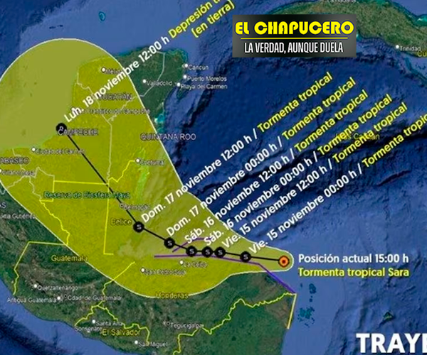 El Servicio Meteorológico Nacional (SMN) indicó que “Sara” se encuentra a 610 kilómetros al este-sureste de Quintana Roo; se espera que impacte al norte de Honduras la madrugada del viernes con movimiento hacia México.