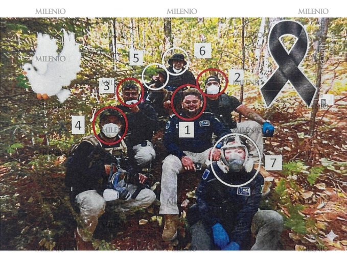 Y es que la imagen, tomada el mismo día en que se desmanteló un narcolaboratorio, muestra a los dos estadounidenses junto al entonces titular de la Agencia Estatal de Investigación, el conductor de la camioneta y otros elementos, todos vistiendo uniformes oficiales de la Fiscalía de Chihuahua, portando armamento institucional y usando guantes de látex, mascarillas de gas y cubrebocas, el equipo exacto que se usa en operativos contra laboratorios clandestinos de drogas.