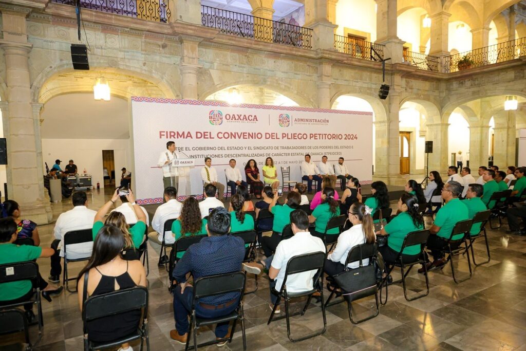El Gobierno del Estado de Oaxaca y el Sindicato de Trabajadores de los Poderes del Estado e Instituciones Descentralizadas de Carácter Estatal de Oaxaca (STPEIDCEO) firmaron el Convenio de incremento salarial de 8.1 por ciento, de los cuales 4.60 por ciento, van directo al sueldo base para este 2024.