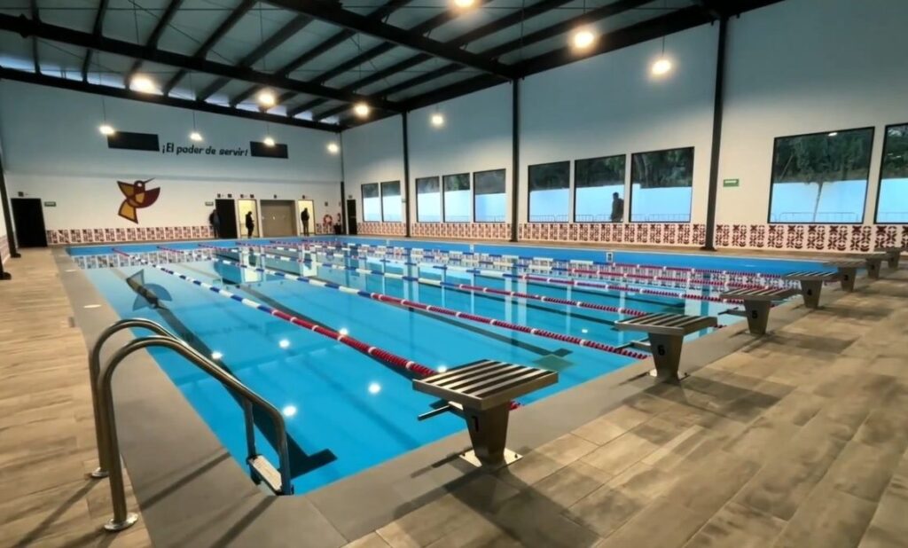 Esta obra beneficiará directamente a más de 2,250 habitantes y generó 1,462 empleos directos e indirectos durante su construcción. El espacio cuenta con siete carriles de competencia, techumbre metálica con cubierta multipanel, gradas para 80-90 espectadores, vestidores, baños generales, cuarto de máquinas equipado con tres calderas, dos bombas y tres filtros, además de banquetas, guarniciones y andadores.