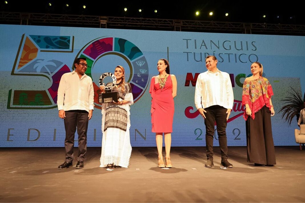 Durante este acto, la gobernadora recibió el reconocimiento al Mérito Turístico, por parte de la secretaria de Turismo federal, Josefina Rodríguez Zamora. «Gracias siempre a Guerrero, gracias gobernadora por volver a hacer un Tianguis histórico, llevamos, solamente como cifra preliminar, 45 por ciento más de citas concretadas», detalló.