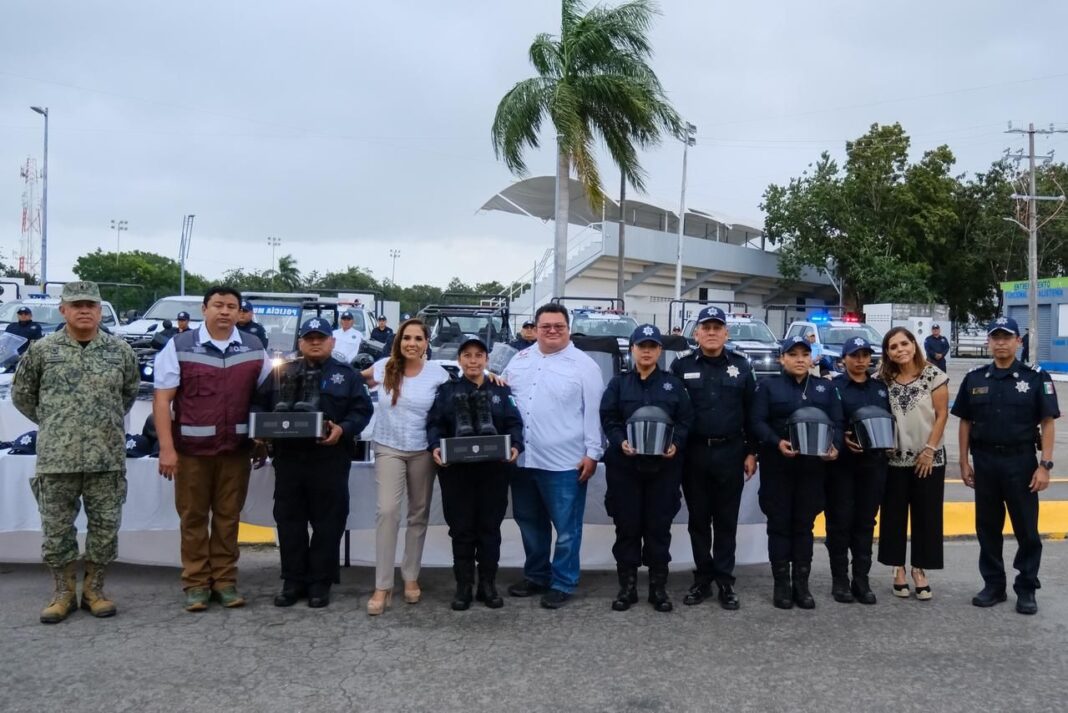 Cozumel.– Con propósito de cuidar la vida, prevenir la violencia y generar confianza, la gobernadora Mara Lezama Espinosa encabezó en Cozumel la renovación y fortalecimiento del parque vehicular, así como la entrega de prendas de protección, vestuario, uniformes, vehículos, mobiliario y equipo tecnológico para la Policía Municipal, como parte de una estrategia integral de construcción de paz con sentido social y transparencia.