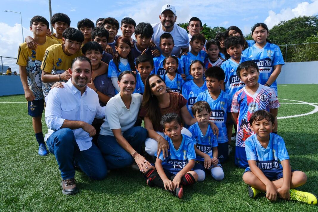 La gobernadora de Quintana Roo, Mara Lezama Espinosa y la presidenta municipal de Benito Juárez, Ana Paty Peralta, encabezaron la entrega de la cancha de pasto sintético completamente renovada en la Región 258 de Cancún, un espacio recuperado que beneficiará a cientos de niñas, niños y jóvenes de la zona al ofrecer instalaciones dignas para la práctica deportiva.