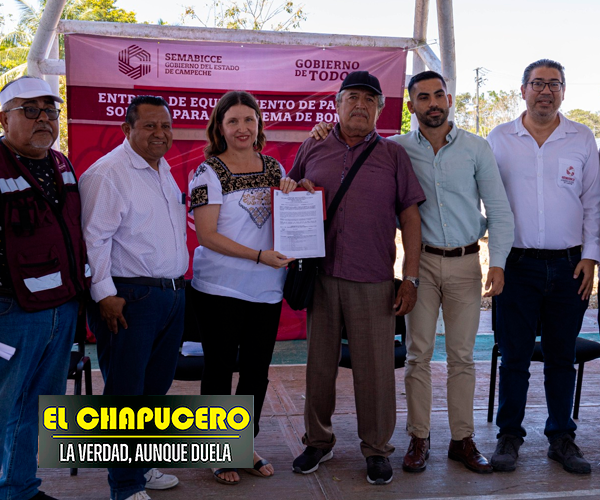 En Justicia Social, municipio de Escárcega, la titular de la Secretaría de Medio Ambiente, Biodiversidad, Cambio Climático y Energía, Jocelyn Durán Murrieta; el titular de la Secretaría de Bienestar, Esteban Hinojosa Rebolledo y autoridades municipales y locales, realizan la inauguración del proyecto de equipamiento con paneles solares que suministra de energía al sistema de bombeo de agua potable de la comunidad.