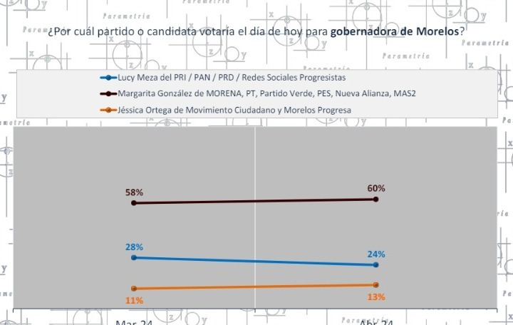 Según un estudio de opinión realizado por la empresa Parametría, en respuesta a la pregunta «¿Por cuál partido o candidata votaría el día de hoy para gobernadora de Morelos?», la candidata de Morena, González Saravia, lidera con el 60 por ciento de las menciones, experimentando un crecimiento significativo.