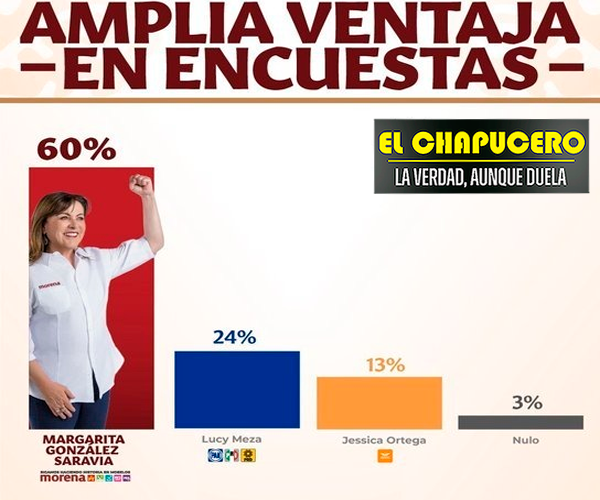 La abrumadora ventaja de 36 puntos de González Saravia sobre Lucy Meza, quien apenas alcanza el 24 por ciento de las intenciones de voto, subraya la tendencia a favor de la candidata morenista, mientras que Jessica Ortega, de Movimiento Ciudadano, sigue en la lona con el 13 por ciento de las menciones.