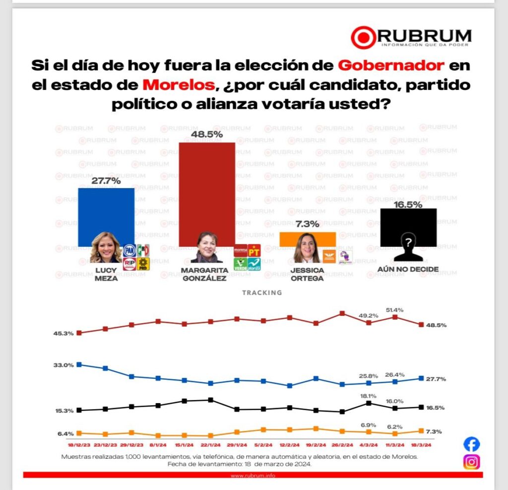 A la pregunta “¿ si el día de hoy fuera la elección de gobernador para Morelos por cuál candidato, partido político o alianza votarías?”, 48.5 % de los encuestados eligieron a la candidata por Movimiento de Regeneración Nacional, Partido del Trabajo, Nueva Alianza, Movimiento Alternativa Social y Partido Encuentro Solidario. Detrás, con 27.7% de las preferencias, aparece la candidata del Frente Amplio por Morelos, Lucy Meza, y con el 7% restante se queda Jessica Ortega, candidata de Movimiento Ciudadano.