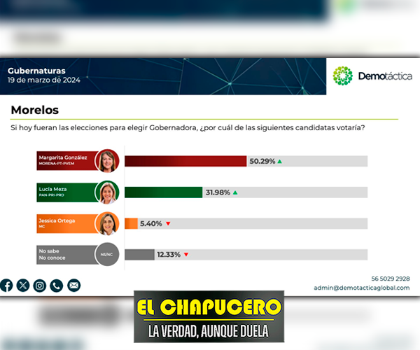 A la pregunta “¿ si el día de hoy fuera la elección de gobernador para Morelos por cuál candidato, partido político o alianza votarías?”, 48.5 % de los encuestados eligieron a la candidata por Movimiento de Regeneración Nacional, Partido del Trabajo, Nueva Alianza, Movimiento Alternativa Social y Partido Encuentro Solidario. Detrás, con 27.7% de las preferencias, aparece la candidata del Frente Amplio por Morelos, Lucy Meza, y con el 7% restante se queda Jessica Ortega, candidata de Movimiento Ciudadano.