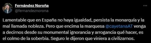 A través de su cuenta verificada en la red social Twitter, Gerardo Fernández Noroña, miembro del grupo parlamentario del Partido del Trabajo (PT), emitió una respuesta contundente dirigida a Cayetana Álvarez de Toledo. En su mensaje, el legislador criticó no solo el sistema político español, incluyendo la persistencia de la monarquía y la nobleza, sino también las declaraciones de la diputada española, a las que calificó como «el colmo de la soberbia» y señaló su «monumental ignorancia y arrogancia».